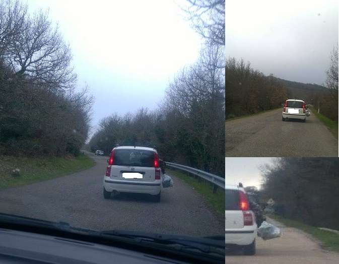 Nella foto (sopra) ne abbiamo un esempio lampante: una macchina con a bordo un gruppo di ragazzi sassaresi che andando via dalla montagna tengono due buste di spazzatura fuori dal finestrino, pronte per il lancio a bordo strada.