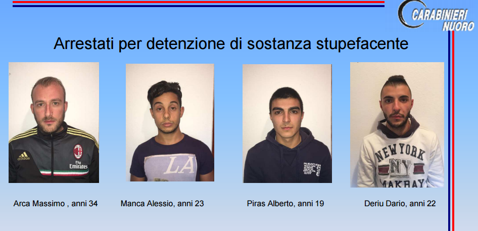 Quattro giovani sono stati sorpresi dalle Forze dell'Ordine mentre confezionavano le dosi da immettere sul mercato e sono stati arrestati per detenzione di sostanze stupefacenti: sono Massimo Arca, Alessio Manca, Alberto Piras e Dario Deriu.