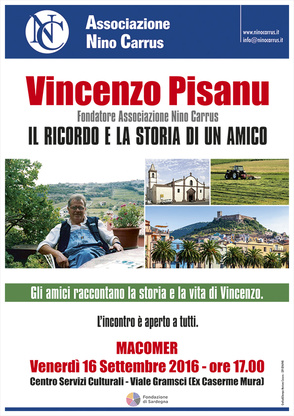 Gli amici provenienti da tutta la Sardegna si incontreranno il 16 settembre a Macomer per ricordare con testimonianze personali la storia e la figura di Vincenzo Pisanu. Non sarà una commemorazione triste ma un incontro ricco di ricordi, fatti e vicende, anche piacevoli, che serviranno a raccontare la vita di questo nostro caro amico.