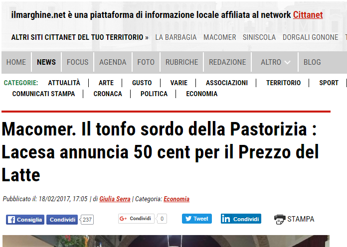 Nella serata di ieri, Sabato 18 Febbraio, avevamo pubblicato un articolo che dava conto della decisione della Lacesa di pagare il latte ai pastori conferitori ad un prezzo base di 50 Centesimi il Litro : notizia emersa nel corso dell'assemblea tenutasi in mattinata presso le ex Caserme Mura di Macomer.