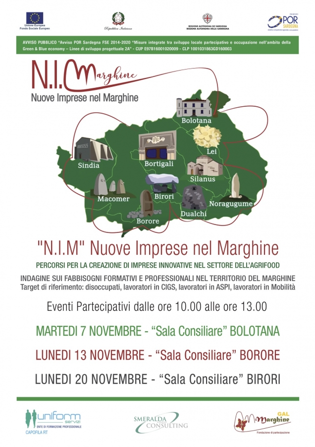 Il 7 Novembre a Bolotana prende avvio il secondo ciclo di percorsi partecipativi nel territorio del Marghine, a un anno dallo sviluppo del piano partecipativo che ha traghettato il GAL Marghine verso la definizione e la stesura del Piano d'Azione Locale. Il programma di incontri vedrà coinvolti i centri di Birori (lunedì 13) e di Borore (lunedì 20). Obiettivo degli incontri è quello di sviluppare sul campo un'indagine esplorativa sui fabbisogni formativi e professionali nell'ambito dell'Agrifood, una delle 7 aree della Strategia di Specializzazione Intelligente (S3) della Regione Sardegna, nonché il focus di intervento dei percorsi per la creazione di impresa e la promozione di lavoro autonomo previsti dal Progetto NIM -Nuove Imprese del Marghine (finanziato dalla RAS con risorse del PO FSE 2014-2020 "Iniziativa Green&Blue Economy" Linea 2). Le risultanze dell'indagine territoriale andranno ad arricchire l'analisi di contesto del Progetto - promosso dal GAL Marghine in raggruppamento con le agenzie formative Uniform Servizi e Smeralda Consulting - e saranno condensate in un report a valenza regionale. Destinatari dell'indagine, gli amministratori locali, le imprese, i servizi locali per l'impiego, i cittadini e le cittadine alla ricerca di lavoro. Tutti gli incontri sono pubblici e saranno ospitati nella Sala Consiliare dei Comuni di Bolotana, Birori e Borore, con inizio alle ore 10:00.