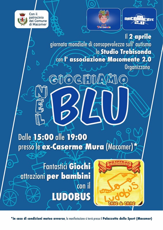 Domani, Martedì 2 Aprile, in occasione della giornata mondiale di consapevolezza sull'autismo, le professioniste dello studio Trebisonda, in collaborazione con l'associazione Macomente 2.0 e il patrocinio del Comune di Macomer, cureranno l'organizzazione di una manifestazione che, dalle ore 15 alle ore 19, aprirà le porte alle attività ludiche coinvolgendo la città tutta ed invitandola ad un approccio consapevole.